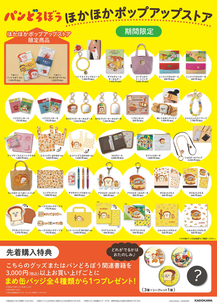 会期中、「パンどろぼう」関連書籍またはパンどろぼうグッズを一度のお会計で3,000円(税込)以上ご購入ごとに、「“まめ缶バッジ”全4種類から1個」をプレゼント!
