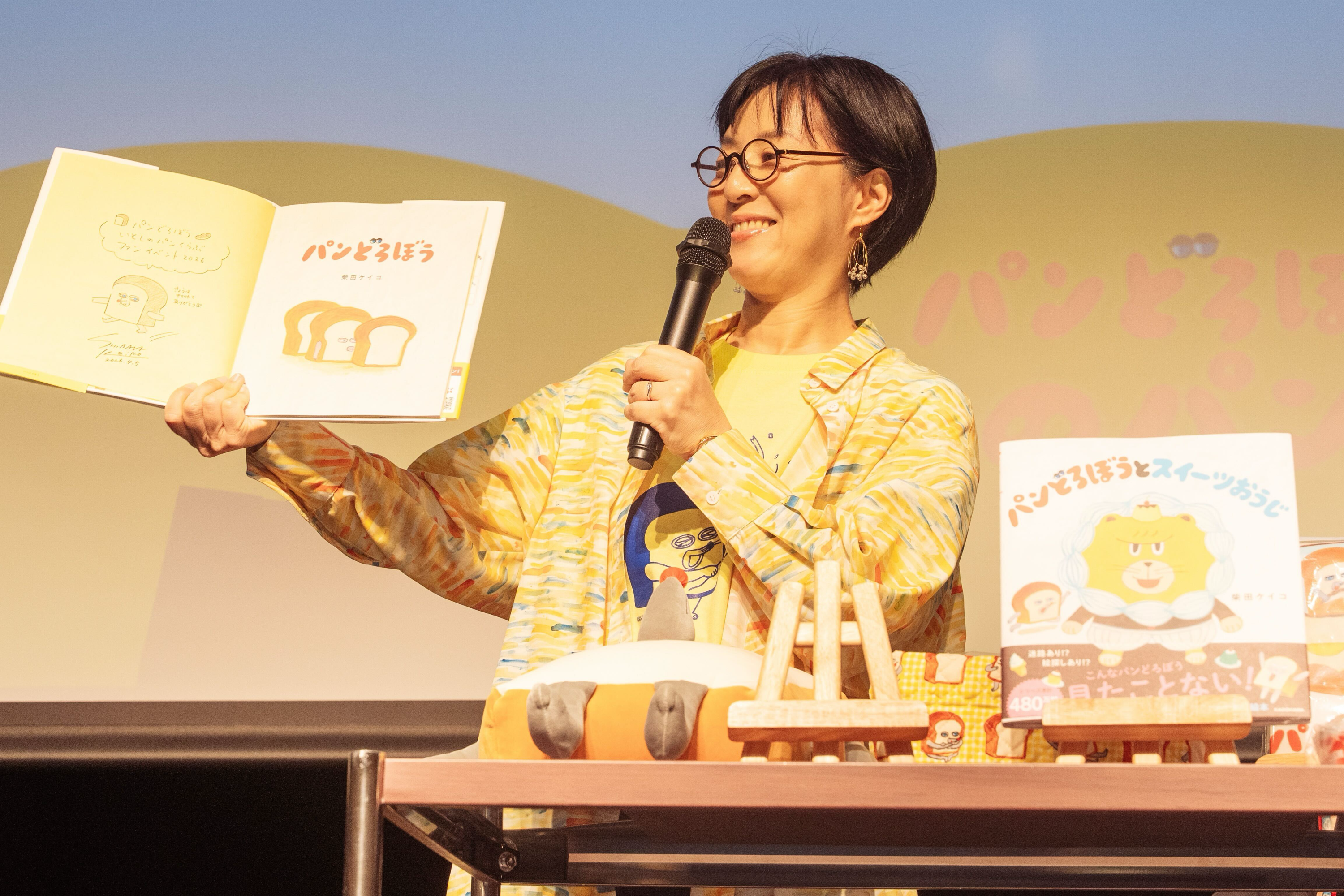イベントがスタートすると、柴田先生が壇上に登場。「今日は高知から来ました。とても緊張していますが、『パンどろぼう』を愛してやまない方々がたくさん来てくださると聞き、楽しみにしていました」とコメントしました。さらに、来場者が持参したぬいぐるみなどのグッズを見て、「持ってきてくれてる! すごくうれしいです!」と笑顔を見せました。
