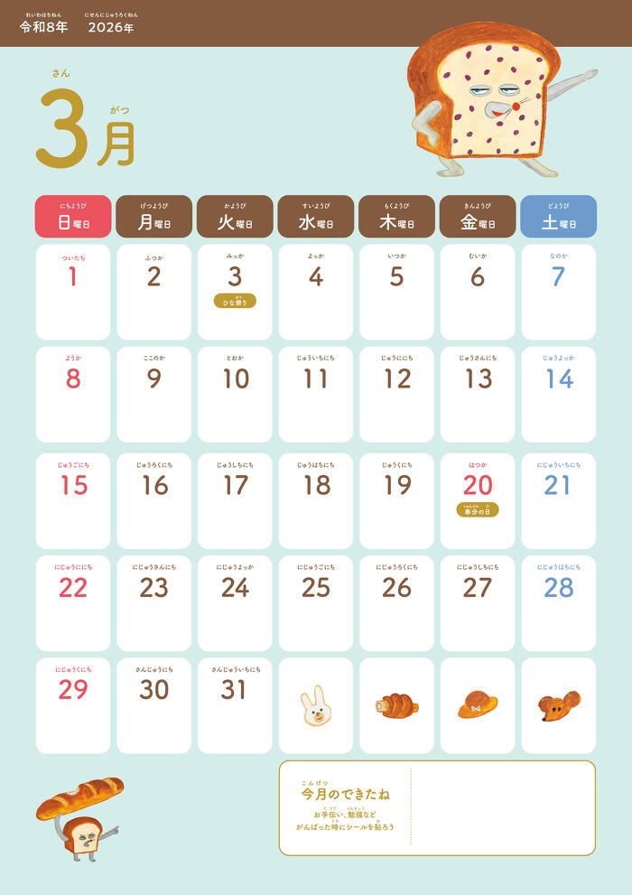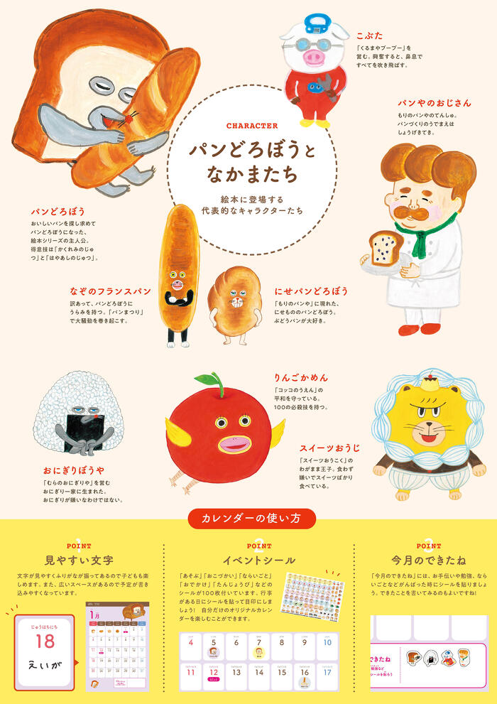 毎月ページをめくるたびに、ユニークで愛らしいパンどろぼうと仲間たちがにぎやかで楽しい1年を演出してくれます。