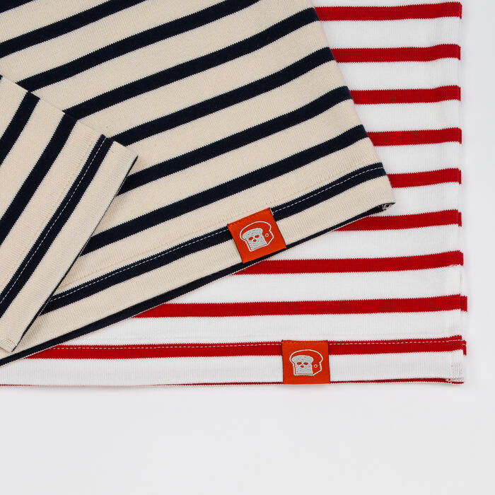 ボーダーカラーの赤、濃紺は『パンどろぼう』の絵本を描く際に実際に使用されているオイルパステルから決定。