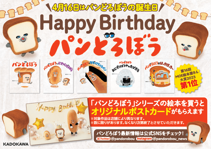 4/16のパンどろぼうの誕生日を記念して、全国の参加書店にて『パンどろぼう』シリーズのフェアが実施されます。