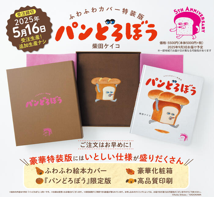 5周年を記念して、特別仕様の絵本第1作、『ふわふわカバー特装版 パンどろぼう』を受注生産で発売いたします。