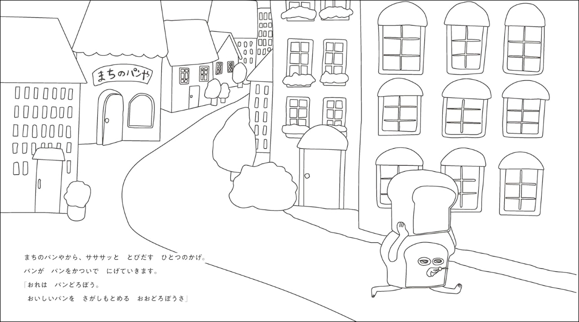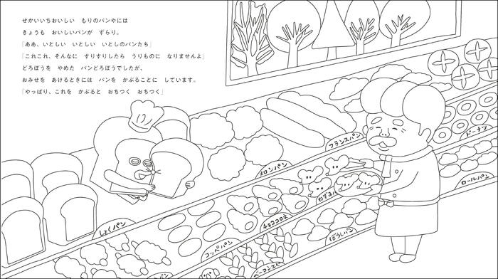 おいしそうな焼き色のパンや、色とりどりの背景が魅力的な『パンどろぼう』が、絵本のままぬりえになりました。