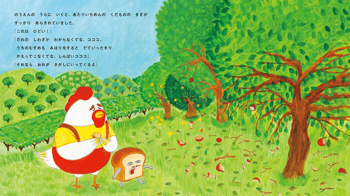 にわとり一家がいとなむコッコ農園へ、パンをとどけにやってきたパンどろぼう。
