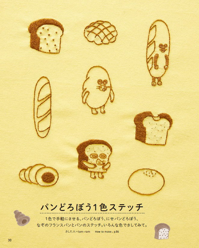 いろんなシーンのパンどろぼうから、にせパンどろぼうやなぞのフランスパンなどシリーズに登場するキャラクター、絵本にでてくるパンやおにぎりまで、かわいい刺しゅうが作り方&実物大図案つきで63点掲載。刺しゅう図案はすべてダウンロードも可能!