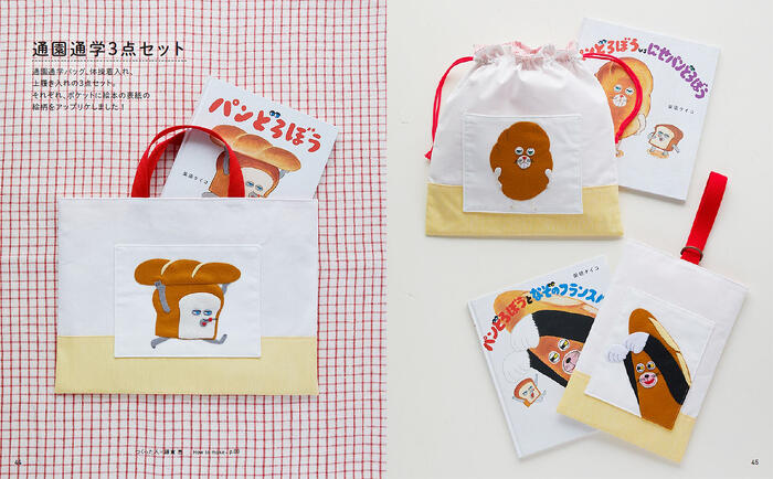 また、フェルトのマスコットやバッグ、ポーチなど小物、さらには通勤通学グッズの作り方もご紹介。手作りで『パンどろぼう』の世界をお楽しみいただけます。