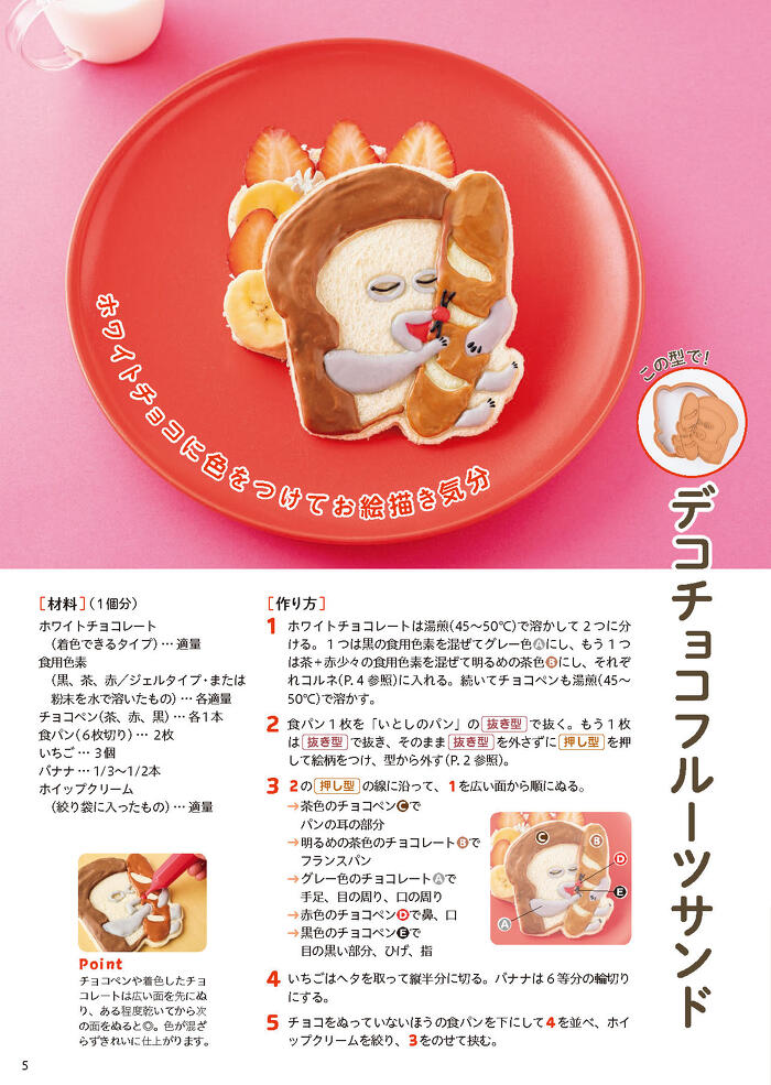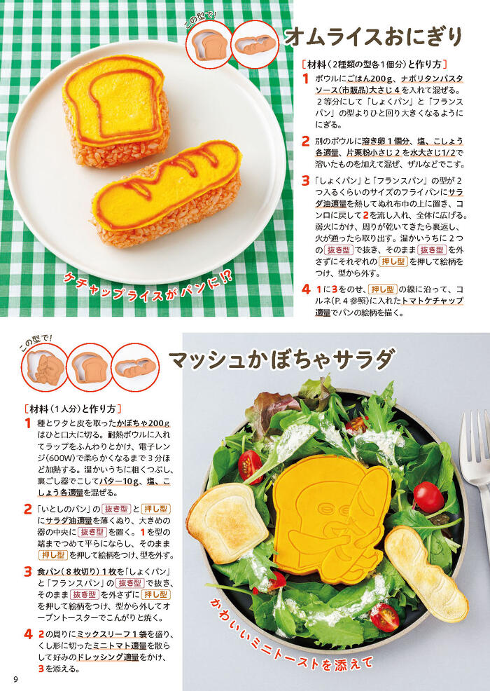 「パンどろぼう」×2種、「しょくパン」、「フランスパン」の全4種類の抜き型&押し型セットを使って、かわいいパンどろぼうのクッキーやどら焼き、ケーキなどのおやつから、カレー、ちらしずし、オムライスまでいろいろなレシピにトライできます。