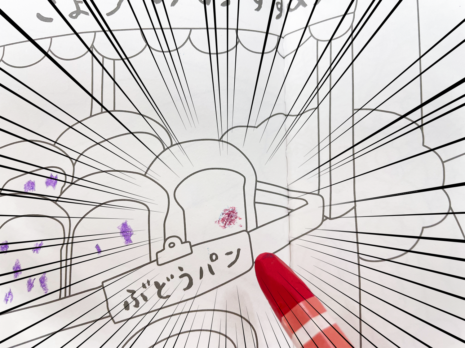\「むらさき」の クレヨンが なくなっちゃったぞ・・・/ \どれどれ/