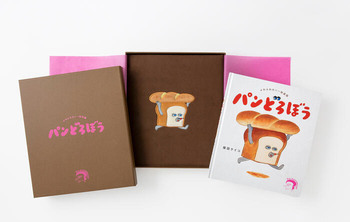特装版の絵本を収めているのは豪華な化粧箱。キラキラなピンクの箔押しはパンどろぼうらしい遊び心を感じる仕上がりです。